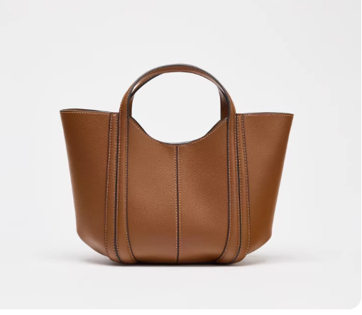Mini city casual bag with contrast topstitching. Features handles and detachable crossbody strap. Detachable inner pouch with zip closure.