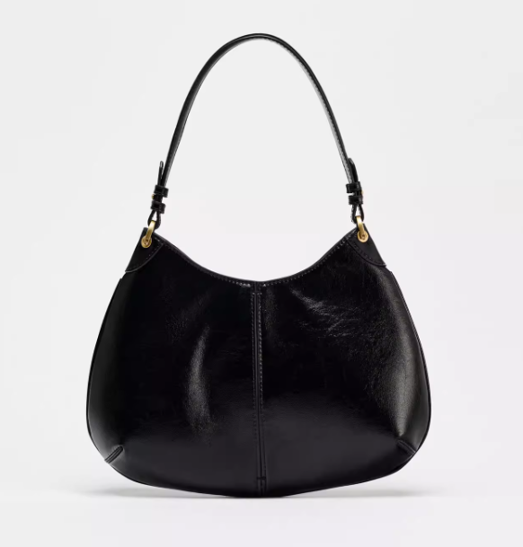 Oval shoulder bag. Boot-style body with topstitching. Features shoulder strap with metal embellishments. Zip interior pocket. Magnetic snap closure.