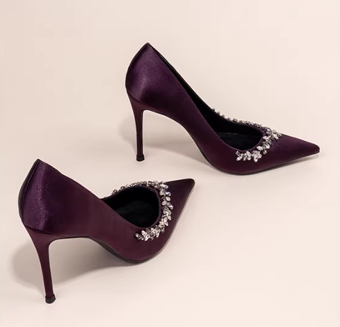 π MUSEUM | High-Heeled Women’s 2026 Spring And Autumn New Thin-Heeled Pointed Toe Rhinestone Shallow French-Style Elegant Single Shoes In Purple