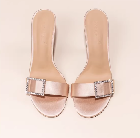 ๐ MUSEUM | Slippers For Women Summer Outdoor New High-Heeled Shoes Thin Heel Rhinestone Square Buckle High-End Feeling One-Strap Nude